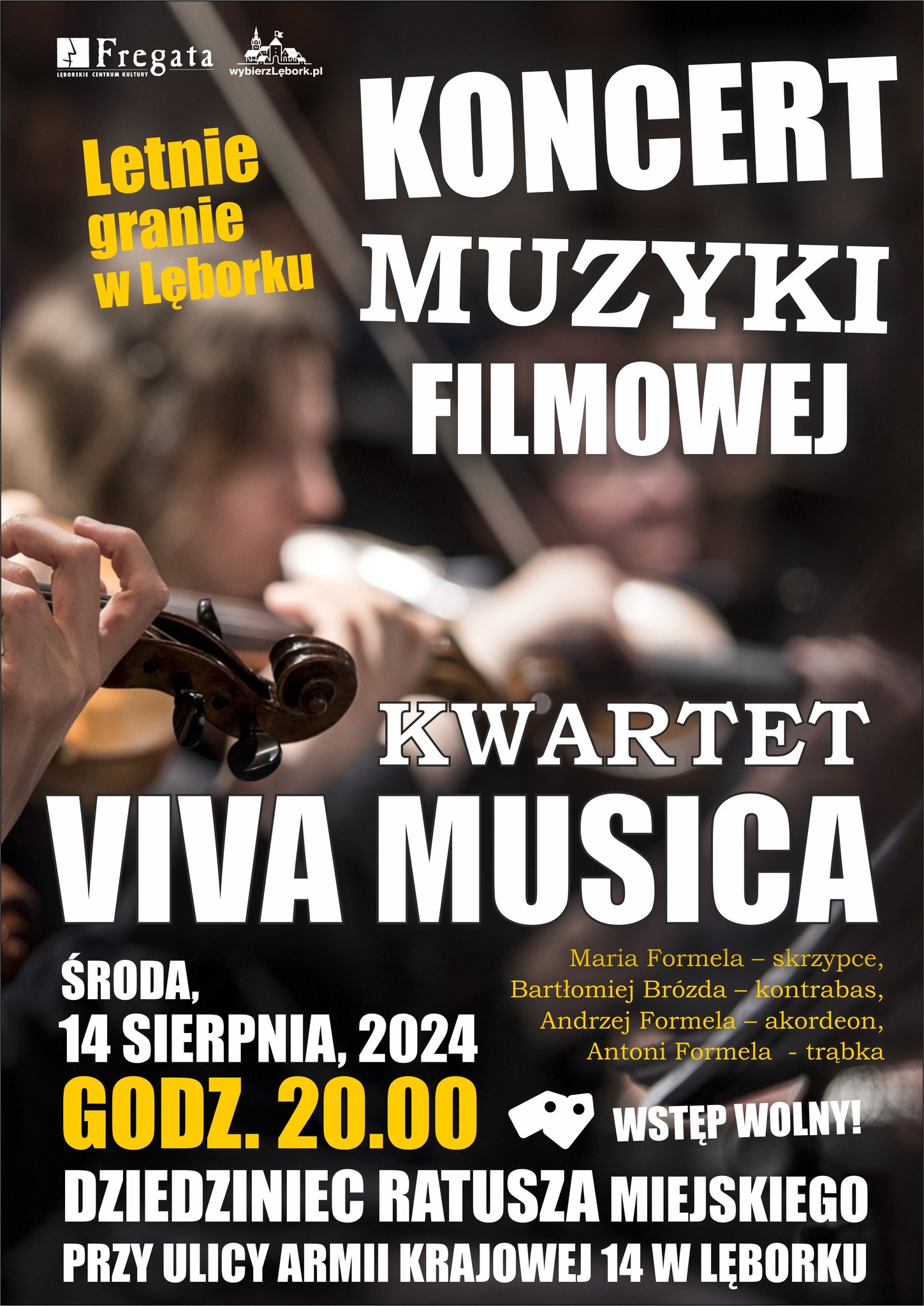 W środę, 14 sierpnia 2024 roku, na dziedzińcu miejskiego ratusza, kwartet VIVA MUSICA zaprezentuje popularne tematy i utwory filmowe. Koncert rozpocznie się o godzinie 20:00. Wstęp jest wolny.