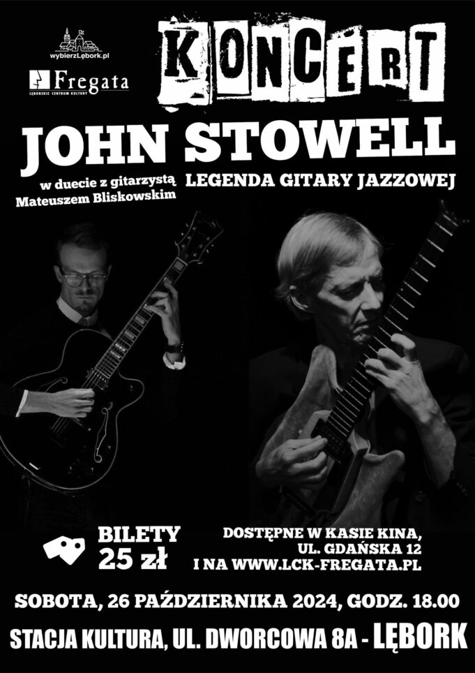 Lęborskie Centrum Kultury „Fregata” zaprasza na wyjątkowy koncert dwóch gitarzystów reprezentujących różne pokolenia i kontynenty. W sobotę, 26 października 2024 roku, na scenie Stacji Kultura wystąpią Mateusz Bliskowski z Lęborka oraz legendarny amerykański gitarzysta jazzowy John Stowell. Koncert rozpocznie się o godzinie 18:00, a bilety w cenie 25 zł można kupić na stronie www.lck-fregata.pl oraz w kasie kina „Fregata”.