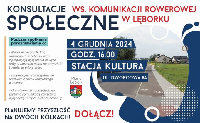 Burmistrz Lęborka zaprasza na konsultacje społeczne dotyczące komunikacji rowerowej w Lęborku. Otwarte spotkanie konsultacyjne odbędzie się 4 grudnia 2024 o godz. 16.00 w Stacji Kultura w Lęborku przy ul. Dworcowej 8a.