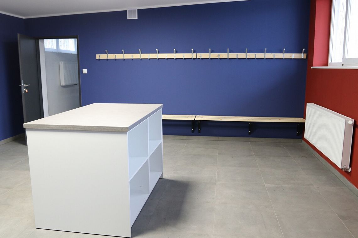 Remont obejmował wymianę podkładów podposadzkowych z izolacją termiczną, płytek podłogowych i ściennych, przebudowę łazienki, wymianę instalacji elektrycznej i armatury sanitarnej, malowanie ścian, wymianę drzwi i bramy garażowej do wymiennikowni oraz wyposażenie pomieszczeń w meble i akcesoria.