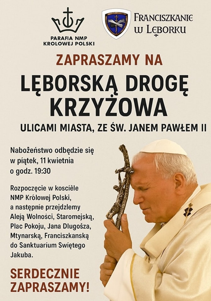Parafie Najświętszej Maryi Panny Królowej Polski oraz św. Jakuba Apostoła w Lęborku zapraszają mieszkańców na wspólną LĘBORSKĄ DROGĘ KRZYŻOWĄ, która odbędzie się w piątek, 11 kwietnia.