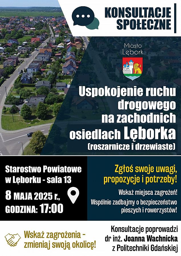 Urząd Miejski w Lęborku zaprasza mieszkańców zachodniej części miasta (osiedla Drzewiaste i Roszarnicze) na konsultacje społeczne dotyczące projektu kompleksowego uspokojenia ruchu i zwiększenia bezpieczeństwa pieszych oraz rowerzystów. Spotkanie odbędzie się w czwartek, 8 maja 2025 r. o godzinie 17:00 w Starostwie Powiatowym (ul. Czołgistów 5). Konsultacje poprowadzi dr inż. Joanna Wachnicka z Politechniki Gdańskiej.