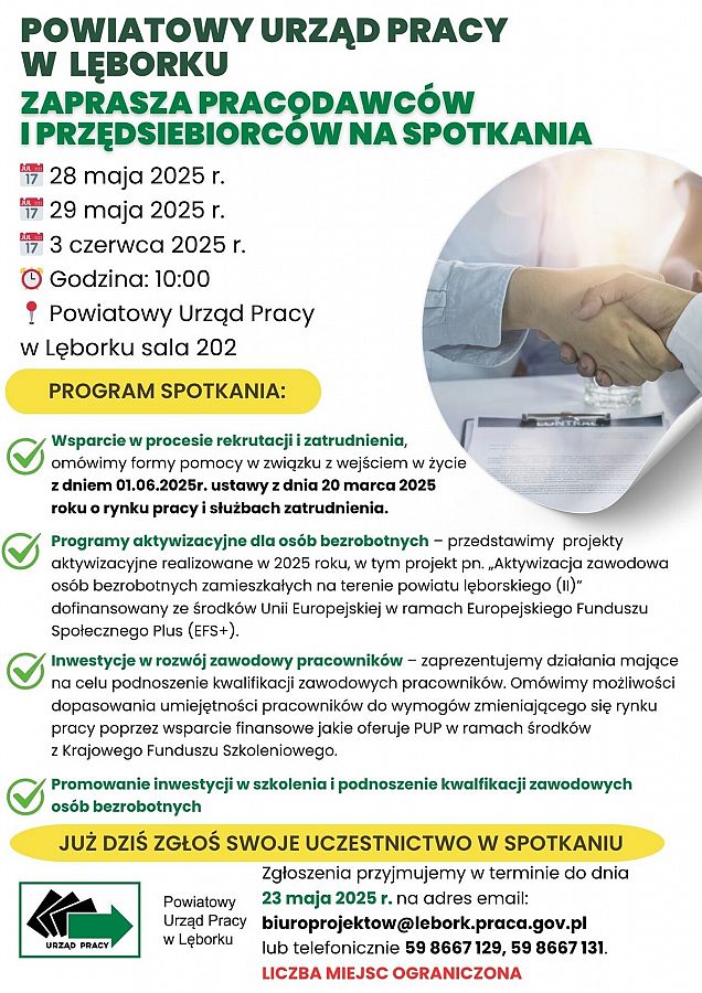 Prosimy o potwierdzenie udziału w spotkaniu oraz wskazanie dogodnego dla Państwa terminu do dnia 23 maja 2025 r. Informację zwrotną można przesłać na adres e-mail: biuroprojektow@lebork.praca.gov.pl lub telefonicznie pod numerami: 59 8667 129 lub 59 8667 131.