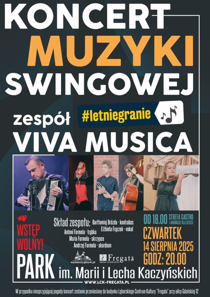 Lęborskie Centrum Kultury „Fregata” zaprasza na kolejne plenerowe wydarzenie z cyklu Letnie Granie. W czwartek 14 sierpnia, w Parku Kaczyńskich odbędzie się koncert zespołu Viva Musica.