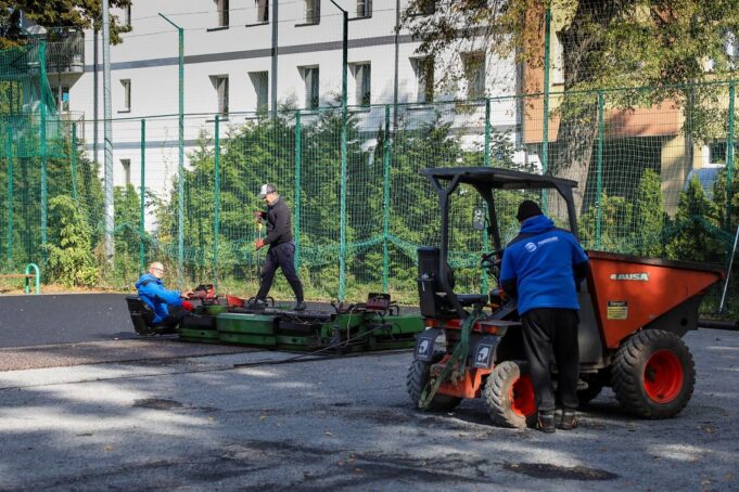 W ramach modernizacji trwa kluczowa wymiana zużytej nawierzchni boiska wielofunkcyjnego EPDM o powierzchni ponad 1540 m². Prace rozpoczęły się od usunięcia starej nawierzchni i rozbiórki betonowej podbudowy. W jej miejsce położono nową warstwę wyrównawczą z kruszywa kamiennego, na której układana jest nowoczesna nawierzchnia EPDM, mająca zapewnić użytkownikom większy komfort i bezpieczeństwo. Dodatkowo, w ramach prac wykonane zostaną nowe linie pomocnicze dla różnych dyscyplin sportowych oraz zbudowana zostanie skocznia do skoku w dal.