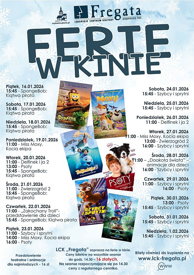 Lęborskie Centrum Kultury „Fregata” zaprasza dzieci, młodzież i całe rodziny na wyjątkowe „Ferie w Kinie”. Na seanse rozpoczynające się do godz. 14:30 koszt biletu to 16 zł a na seanse po godz. 14:30 – ceny według regularnego cennika.