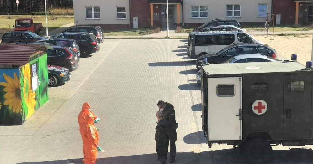 Od kilkunastu dni na terenie województwa pomorskiego można zobaczyć obrazki takie jak ten przedstawiony na zdjęciu. Żołnierze, w tym dwóch ubranych w pomarańczowe kombinezony ochronne z założonymi rękawiczkami, maseczkami i goglami, przyjeżdżają wojskową sanitarką. Kogoś odwiedzają, a następnie po odkażeniu kombinezonów chowają je do specjalnych czerwonych worków i odjeżdżają.