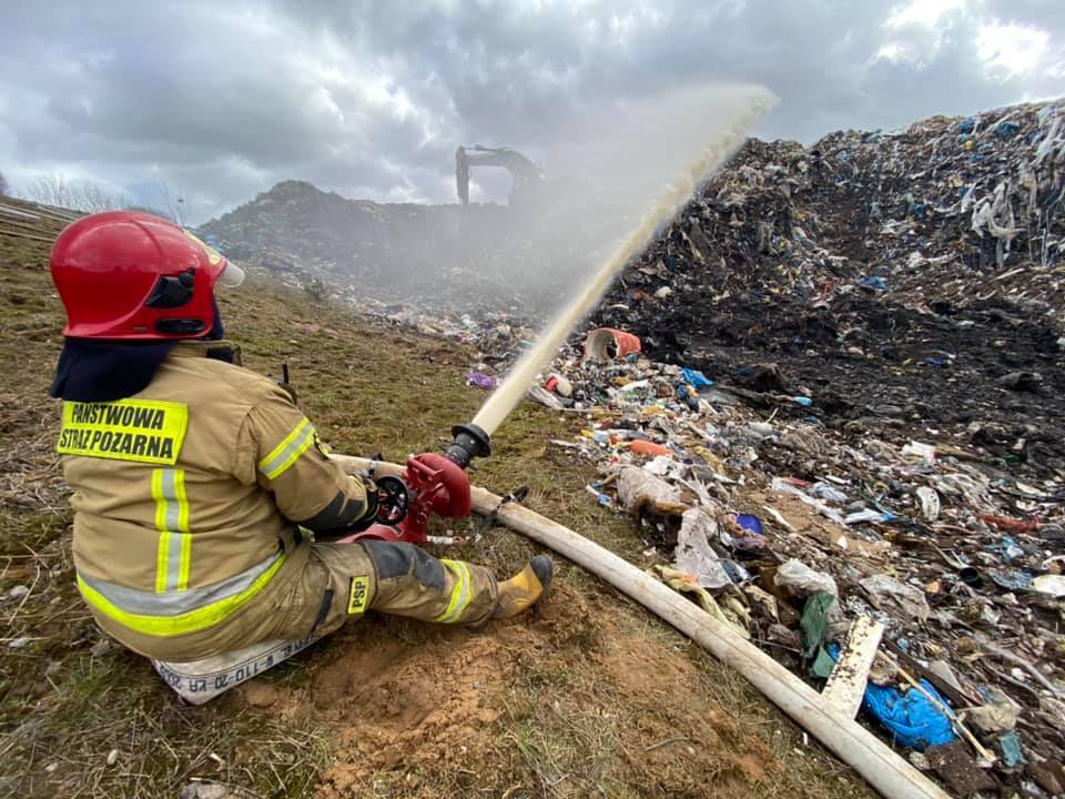 Zgłoszenie o pożarze wypłynęło do strażaków 10 marca o godz. 3:46. Na miejsce zdarzenia zadysponowano 6 zastępów straży pożarnej. Po dojeździe stwierdzono, że pali się pionowa skarpa pryzmowa śmieci o wymiarach 20 metrów szerokości i 10 metrów wysokości. Strażacy zabezpieczyli miejsce zdarzenia, podali łącznie osiem prądów wody w natarciu na palącą się pryzmę oraz zbudowali stanowisko wodne w celu ciągłości podawania środka gaśniczego. Na następnie przy pomocy ciężkiego sprzętu (koparek i spycharek) sukcesywnie przekopywano pryzmę i dogaszano i wywożono palące się materiały.