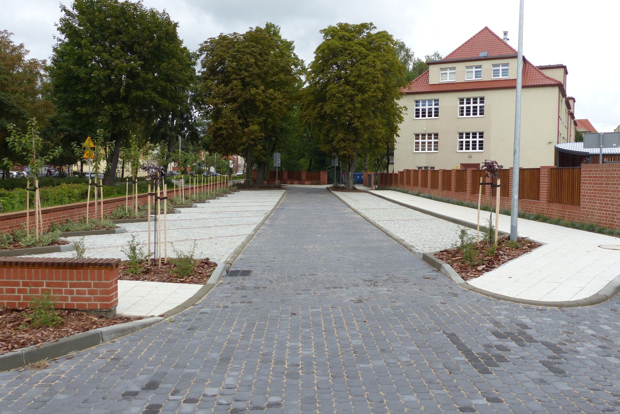 Z miejsc postojowych korzystać będą pracownicy szkoły oraz rodzice uczniów. W godzinach pracy szkoły parkowanie na ogólnodostępnym parkingu zostało ograniczone czasowo do 10 minut. Zapewni rotację parkujących samochodów i pozwoli rodzicom na sprawne i bezpieczne zawiezienie i odebranie dzieci ze szkoły. Przy szkolnym budynku, także w cieniu drzew postawiono ceglane murki z drewnianymi siedziskami aranżując w ten sposób miejsca do wypoczynku czy spotkań. Przy boisku wybudowano dyskretną wiatę śmietnikową mogącą służyć także jako zadaszony parking dla rowerów. W trakcie inwestycji zachowano wszystkie rosnące tam drzewa oraz dokonano nowych nasadzeń.